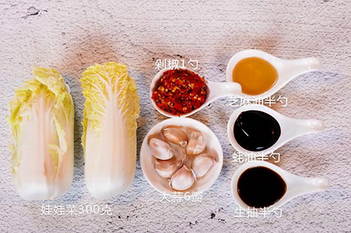 大蒜6瓣,剁椒1勺,三色娃娃菜的做法 娃娃菜怎么做好吃小葱2根,生抽半勺,芝麻油半勺,蚝油半勺,鸡精半勺;