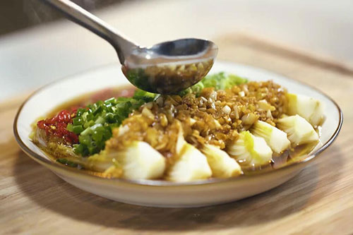 6.铺在娃娃菜上,撒上葱花,锅中放入适量油,烧至7成热,淋在蒜蓉和剁椒、葱花上即可。