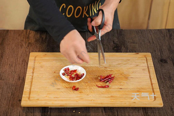 2.小葱切段,姜、蒜切粒,干辣椒剪成段。