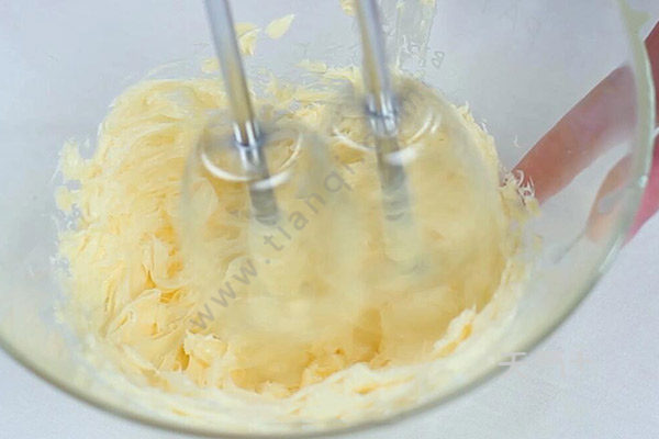 2.黄油打发变白,分次加入牛奶打至光泽。