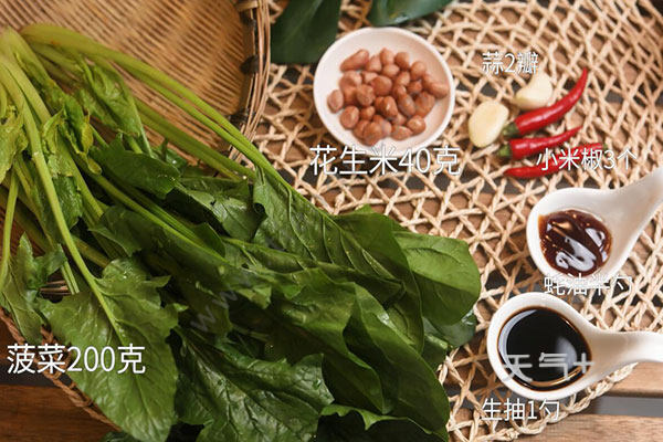 菠菜切段,小米椒切圈,热锅冷油,放入花生米小火炒熟,捞出待用,放入菠菜焯水1分钟捞出,放花生、蒜末、小米椒、等食材拌匀,扣入盘中即可。