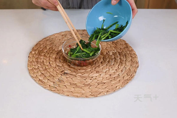 1.菠菜洗净切段。小米椒切圈,蒜切末;