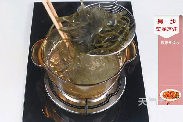 1.海带丝洗净,蒜切末,干辣椒剪成段。