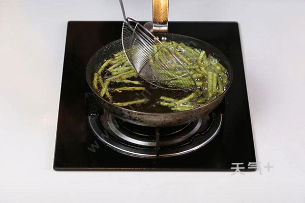 2.油温烧至7成热,放入豇豆炸至微焦,捞出待用。