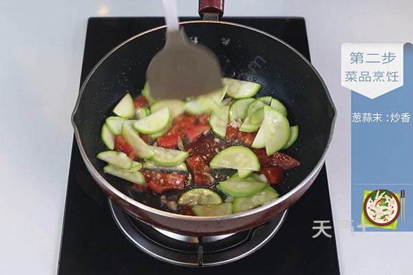 2.油温烧至6成热,放入葱蒜末炒香,放入西葫芦略炒,放入西红柿炒至出汁;