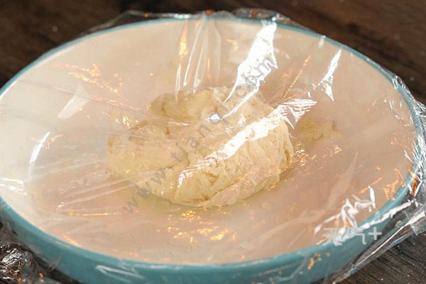 2.再用手揉捏至紧致,揉成团后盖上一层保鲜膜,发酵完后再用手揉捏压实。