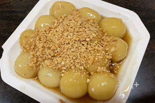 水约130克(约22个的量),红糖50克,生姜3片,水50克(糖浆汁),花生碎50克,黑白熟芝麻,白糖30克 (配料);