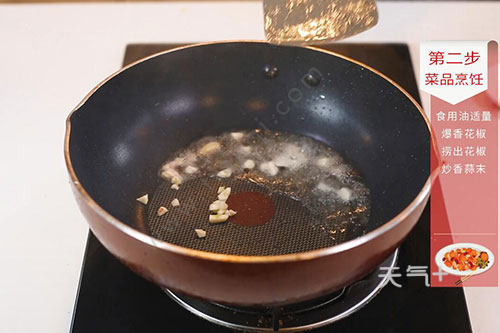 2.锅中倒入适量油,油温烧至6成热,放入花椒爆香,捞出,放入部分蒜末炒香;