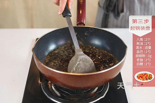4.锅中留底油,放入八角爆香,放入蚝油翻炒。加入适量清水、盐1勺、胡椒粉3克、老抽1勺、白糖1勺大火煮开;
