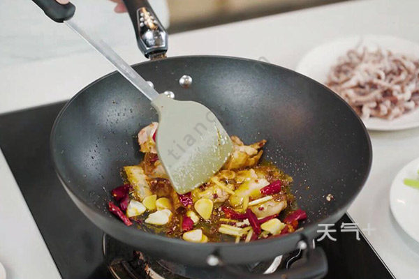 3.锅中放入适量油,油温烧至7成热,放入五花肉煸至出油,加入豆瓣酱1勺、姜丝蒜片、花椒粒、干辣椒段炒出红油,然后放入芹菜段、鱿鱼须翻炒2分钟。