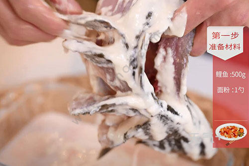 1.将鱼洗净,在鱼身两侧划口子(尽量深一点),面粉加入适量水调成糊,均匀涂抹在鱼身上;