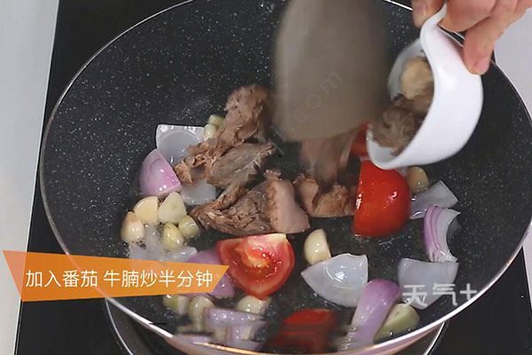 2.油温烧至6成热,放入一半的洋葱和蒜粒炒1分钟,再加入番茄 牛腩翻炒半分钟;