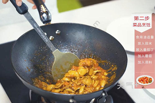 3.加入切好的蘑菇翻炒至断生,加入番茄酱1勺、生抽半勺翻炒均匀;