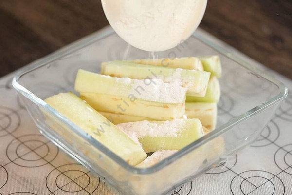 1.茄子去皮切条,放入装有清水的碗中浸泡一会儿,用手捞出沥干水分,再放入碗中倒入淀粉。