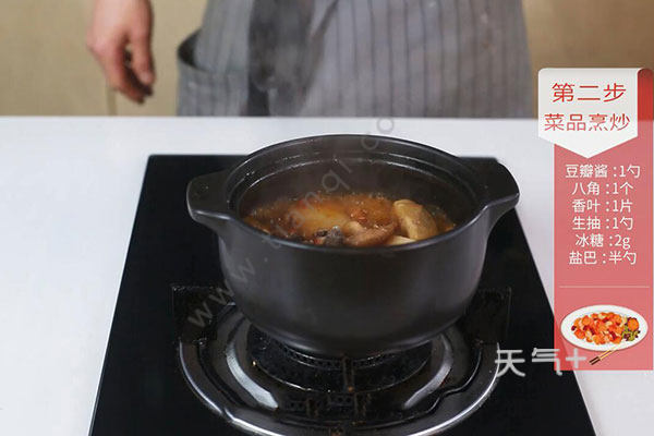 3.倒入炖锅中炖煮15分钟,大火收汁后放入盐半勺、鸡精半勺拌匀后盛出,撒上葱花即可。
