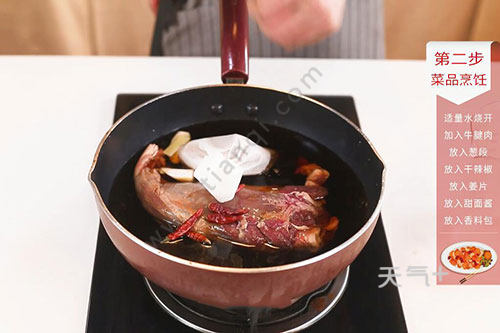 3.将腌制好的牛腱肉放入锅中,倒入剩余的汤汁,加入适量清水煮开,放入姜片、葱段、干辣椒、香料包、甜面酱煮开,换小火炖煮2小时15分钟;