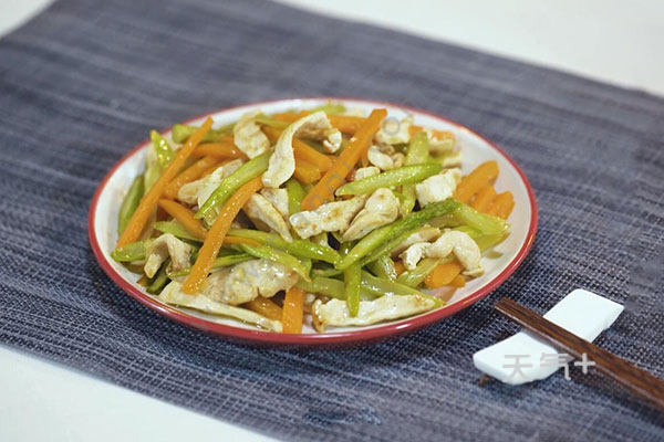 3.再在锅中放入鸡柳炒至变色,加入姜蒜末炒香,放入胡萝卜、芦笋翻炒均匀,调入盐、鸡精,水淀粉,炒匀后放入几滴香油即可。