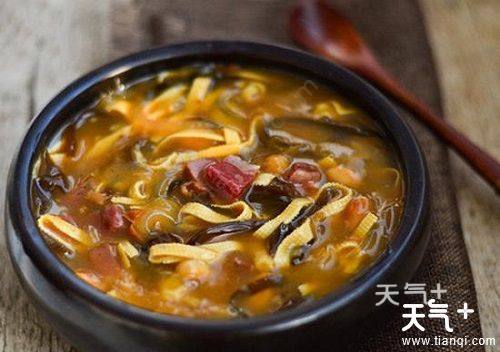 用面粉、香菜、菠菜、粉条、海带丝,葱、姜末少许。精盐、胡椒粉,酱油、醋配料以一定的比例烧沸而成,粘稠如粥,酸辣可口。