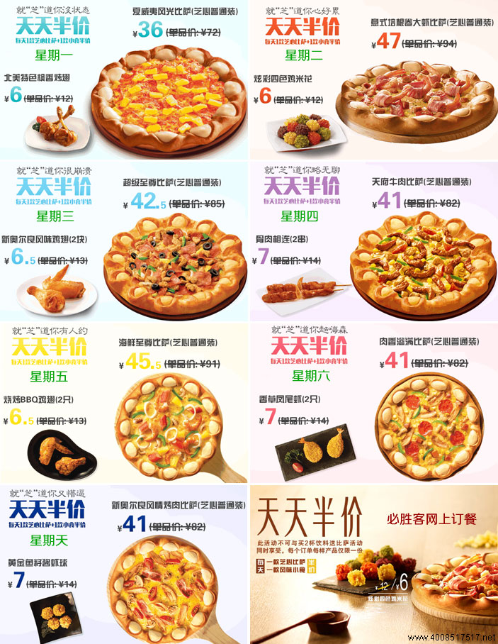 周一天天半价夏威夷风光芝心36元起,北美特色枫香烤翅6元起。星期二半价意式培根卷大虾芝心比萨,炫彩四色鸡米花。