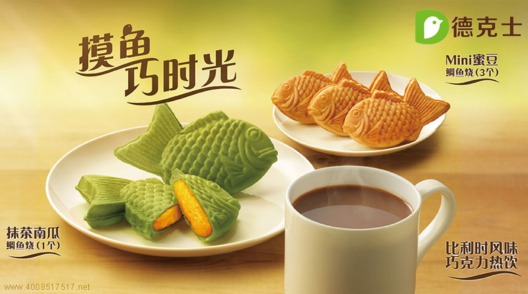 德克士摸鱼的好时光来了,Mini蜜豆鲷鱼烧,抹茶南瓜鲷鱼烧菜单,鱼形状的外观,迷人惹人爱,再搭配比利时风味巧克力热饮料,定能让你在这个冬季享受到不一样的美好时光。