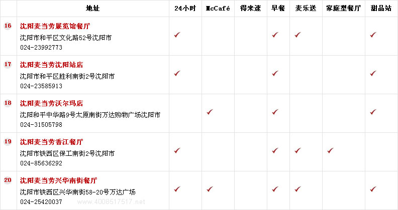 20、沈阳麦当劳兴华南街餐厅、沈阳市铁西区兴华南街58-20号万达广场,电话:024-25420037