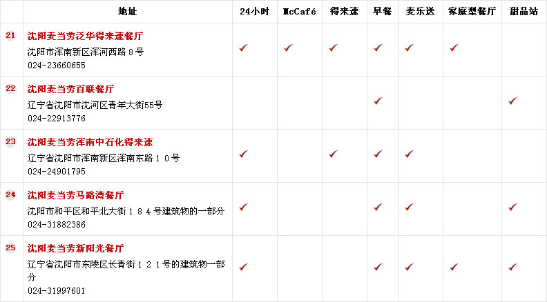 21、沈阳麦当劳泛华得来速餐厅、沈阳市浑南新区浑河西路8号,电话:024-23660655