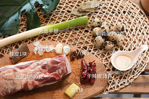 姜切片,蒜切片,大葱切段;2.锅中放鹌鹑蛋加水烧开,煮5分钟捞出剥壳,五花肉煮10分钟捞出切方,油温烧至7成热,放五花肉块煸炒至表面金黄,加鹌鹑蛋,放料酒、生抽、姜蒜片、葱段、八角、等炒匀,加清水、老抽大火煮开,倒入炖锅焖煮25分钟,加鹌鹑蛋焖20分钟即可。
