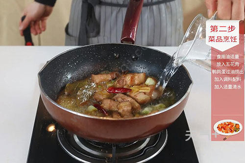 3.锅中放入适量油,油温烧至7成热,放入五花肉块大火煸炒至表面金黄,加入鹌鹑蛋翻炒至微焦。放入料酒1勺、生抽1勺、姜蒜片、葱段、八角2个、桂皮1块、香叶2片、干辣椒、冰糖10克翻炒均匀。加入清水适量、鹌鹑蛋红烧肉的做法 家常鹌鹑蛋红烧肉做法老抽半勺大火煮开;