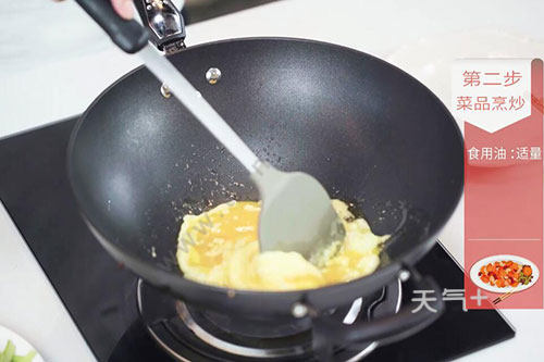 3.锅中放适量油,油温烧至7成热,倒入蛋液翻炒成型后盛出待用;