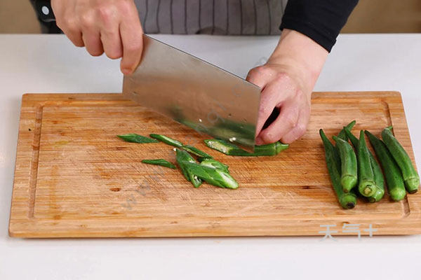 2.秋葵放入沸水中焯水1分钟,捞出切厚片。