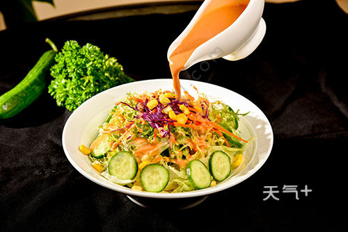 半杯胡萝卜汁,2汤匙乳酪,1汤匙菜籽油,香煎三文鱼,口蘑蔬菜沙拉