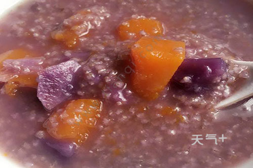 6.在小米中加入南瓜泥,煮至小米粥逐渐浓稠时,加入紫薯小汤圆,再煮5分钟即可出锅。