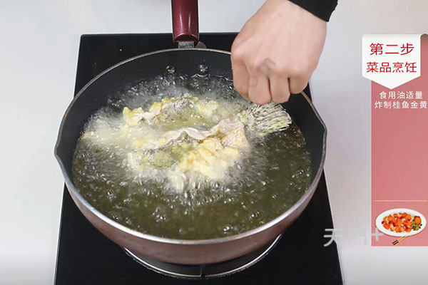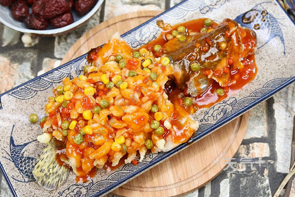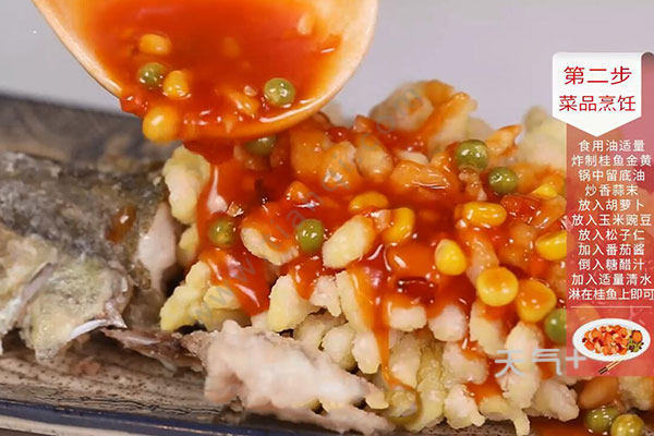 蒜切末,桂鱼洗净处理好,加鸡蛋黄、盐,裹上淀粉,碗中放白糖、白醋、盐拌匀,油温烧至6成热,提着头部、尾部放入锅内炸制,提着尾部炸30秒,放鱼头、鱼肉炸3分钟捞出,留底油,放蒜末炒香,放胡萝卜、玉米、豌豆炒至断生,加番茄酱、松子仁炒匀,倒糖醋汁、清水熬至浓稠,加油拌匀淋在炸好的鱼上。