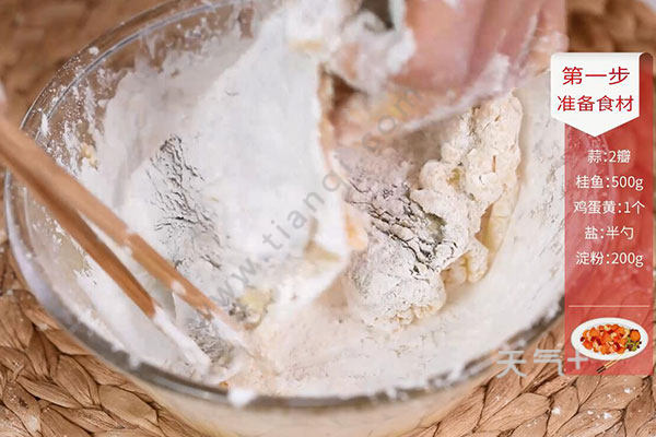 桂鱼500克,鸡蛋黄1个,淀粉200克;