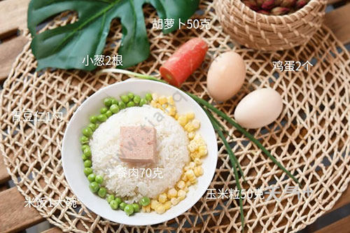 米饭1大碗,鸡蛋2个,午餐肉70克,青豆仁1勺,胡萝卜50克,玉米粒50克;
