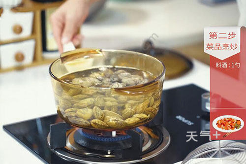 3.锅中放入适量水烧开,放入蛤蜊、料酒1勺煮2分钟后捞出装盘待用;