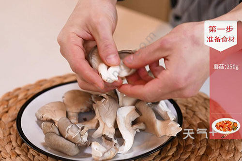 1.蘑菇洗净,撕成小块,锅烧开水,放水里一勺盐,放入蘑菇焯软,捞出放凉水过凉,捞出用手攥干水分,放入盐半勺、花椒粉3克拌匀;