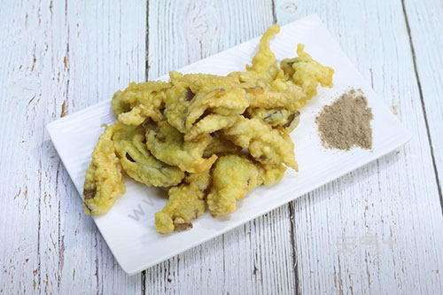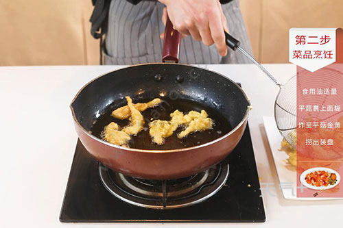 3.锅中放入适量油,油温烧至7成热,将平菇逐个裹上蛋糊放入锅中,中小火炸至金黄,捞出装盘即可。