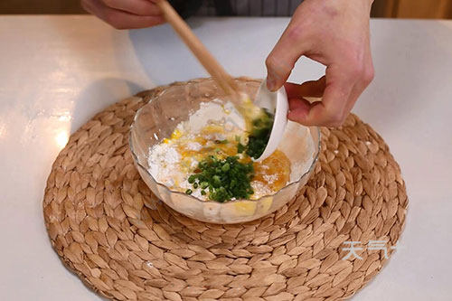 1、小葱洗净切葱花,鸡蛋磕入碗中,加半勺盐打匀,加入面粉、凉水适量搅拌至无颗粒。倒入葱花拌匀;