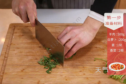 2.白萝卜切块。姜切片,香菜从中间部分切断,根部切长段,香菜叶切碎,葱白切长段,葱叶切葱花;
