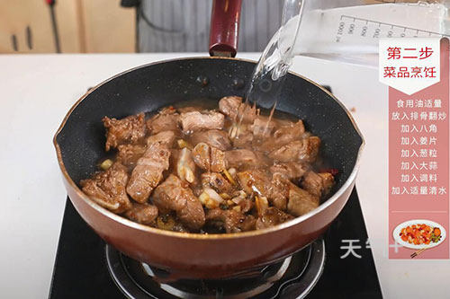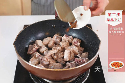 2.锅中放入适量油,油温烧至7成热,放入排骨中火翻炒,炒至排骨表面微焦,加入八角、姜片、葱粒、大蒜炒香;