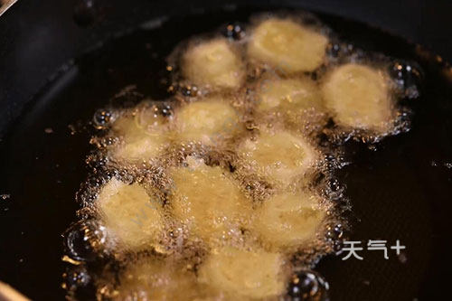3.锅中倒油加热至六成,用勺子挖出萝卜面糊下油锅,至丸子浮起成金黄色即可,捞出沥干油份。
