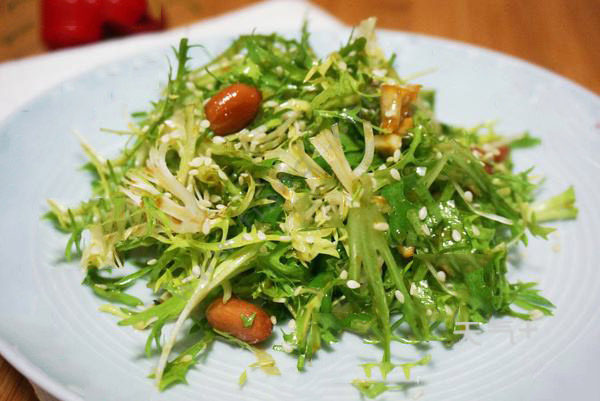 苦菊1把,香葱2根,香菜1根,醋半勺,凉拌酱油1勺,盐少许,糖少许,花生米适量,白芝麻