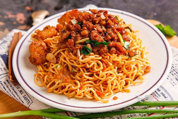 7.将炒好的肉末浇在炒面上,拌匀即可食用。