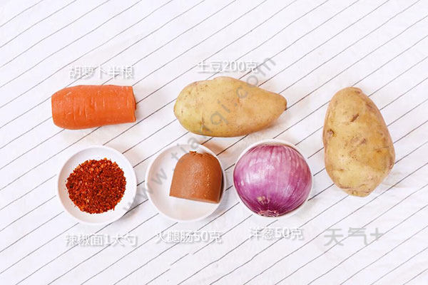 土豆200克,火腿肠50克,洋葱50克,胡萝卜半根;