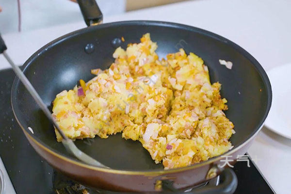 2.再把土豆去皮洗净,切厚片,放入锅中蒸20分钟,用勺子将蒸好的土豆压碎接着在锅中放入适量油,油温烧至6成热,放入火腿肠、胡萝卜、洋葱丁翻炒片刻。