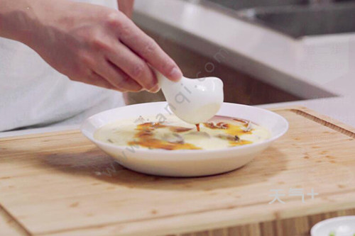 6.蛋液倒入装有花蛤的盘中;