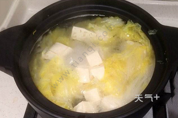 白菜用手撕开,豆腐切块,备用。砂锅里面加入适量水,大火烧开。下入白菜和豆腐,再加入姜片,开始煮。调入盐少许,继续小火煮10分钟左右,关火,滴几滴香油即可。