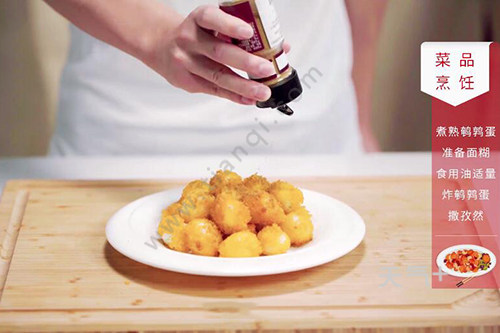5.锅中放入适量油,油温烧至7成热,依次放入鹌鹑蛋炸至金黄,盛出装盘;