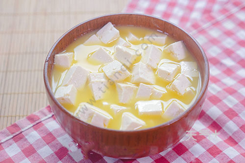 5、加汤约100毫升,勾芡一下,然后将芡汁淋在南豆腐上即可。